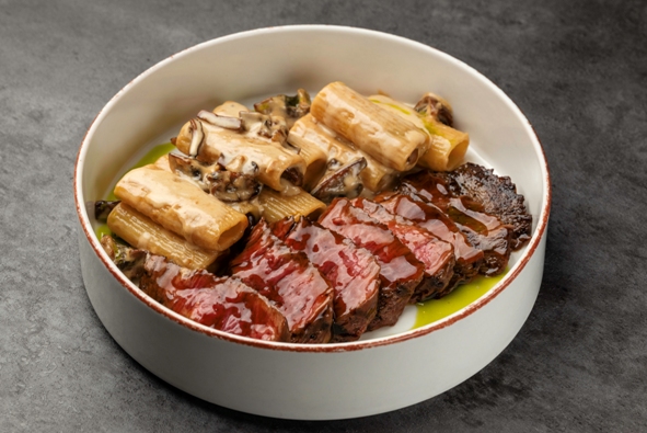 Стейк Вегас со сливочным ригатони