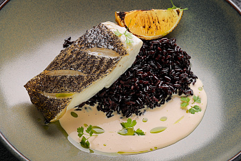 Палтус с черным рисом и сливочно-устричным соусом