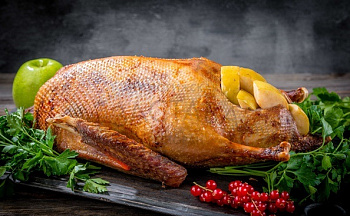 Начинка на Ваш выбор: мы рекомендуем утку, фаршированную сочными фруктами (яблоки, апельсины), но так же можем приготовить ее с гречей с грибами, гречей с овощами, рисом с овощами. Вес блюда от 2,5 килограммов