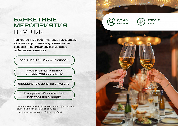 УГЛИ - ресторан созданный для больших и маленьких торжеств. Основное помещение ресторана поделено на уютные зоны, рассчитанные на компании от 8 до 40 человек.